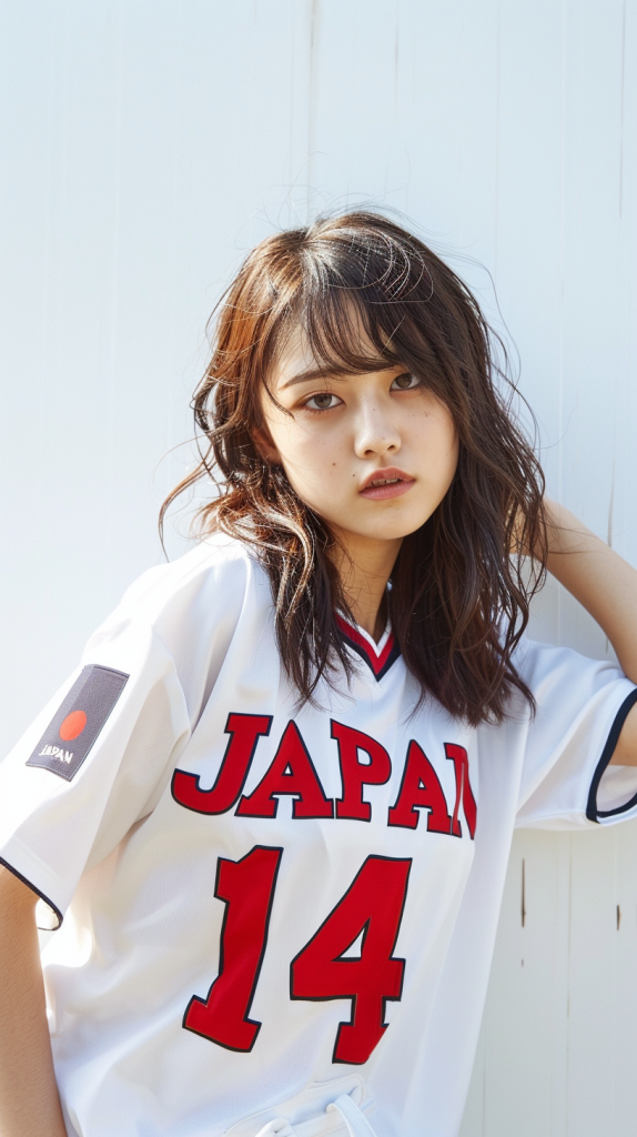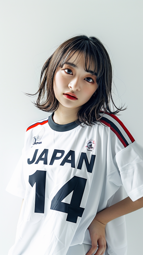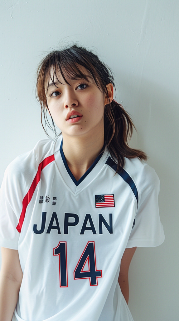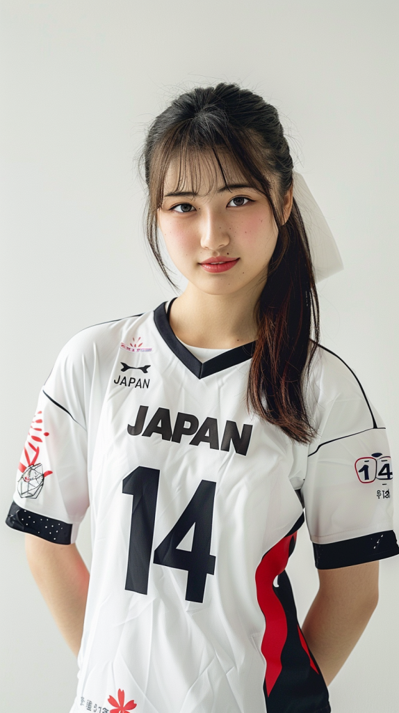 「JAPAN」の文字と背番号「14」がプリントされた白いスポーツ・ジャージを着ている20歳のキュートな日本人女性。真っ白な背景の中で、彼女は少し微笑みながら自信に満ちたポーズをとっている。シーンは明るく照らされ、彼女の衣装のきれいなラインと色を際立たせている。構図は彼女の上半身に焦点を当て、スポーティでカジュアルなスタイルをとらえている。