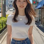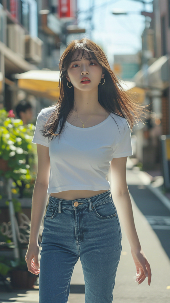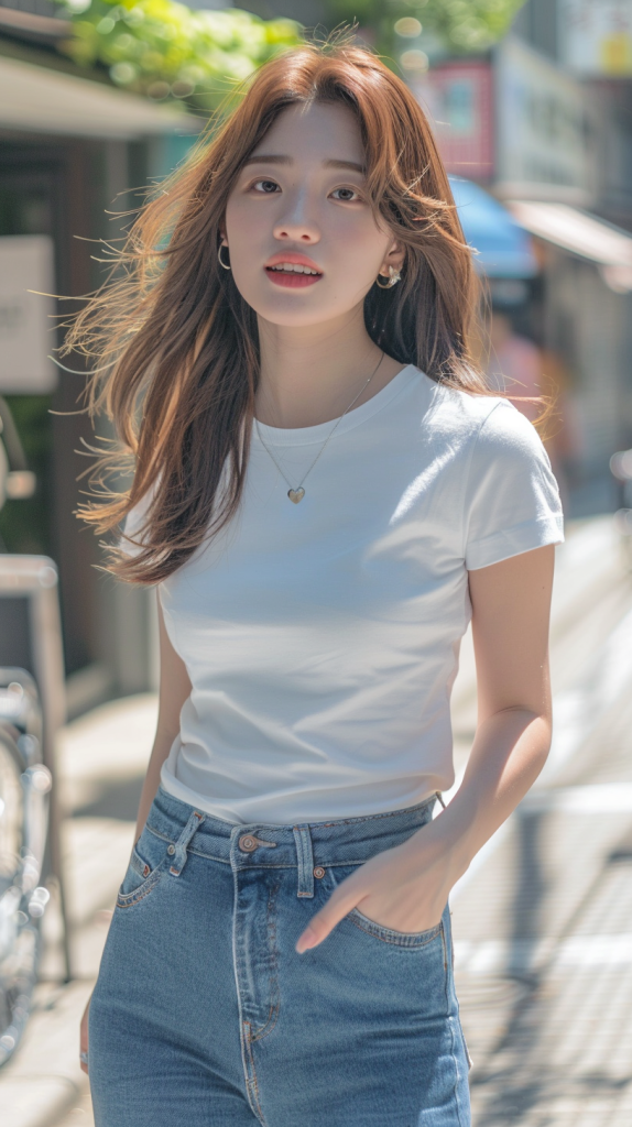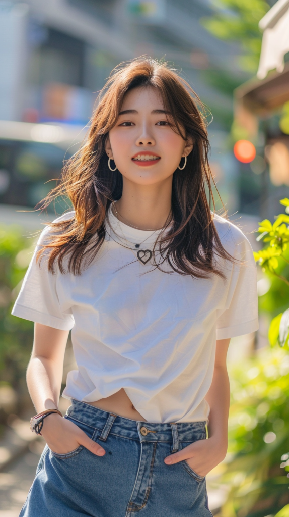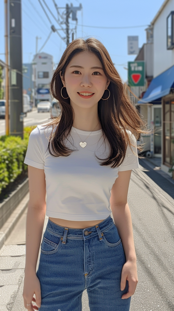 ピチピチの白いTシャツにブルージーンズという、提供された画像にあるような服装をした20歳のかわいい日本人女性。彼女は陽光が降り注ぐ通りを、明るくリラックスした表情で自信たっぷりに歩いている。背景には緑があり、お店があり、軽い交通がある活気のある街が写っている。彼女の髪は自然に流れ、ハート型のネックレスとフープイヤリングで飾られている。構図は彼女の上半身とみぞおちに焦点を当て、カジュアルでありながらスタイリッシュな姿を際立たせている。