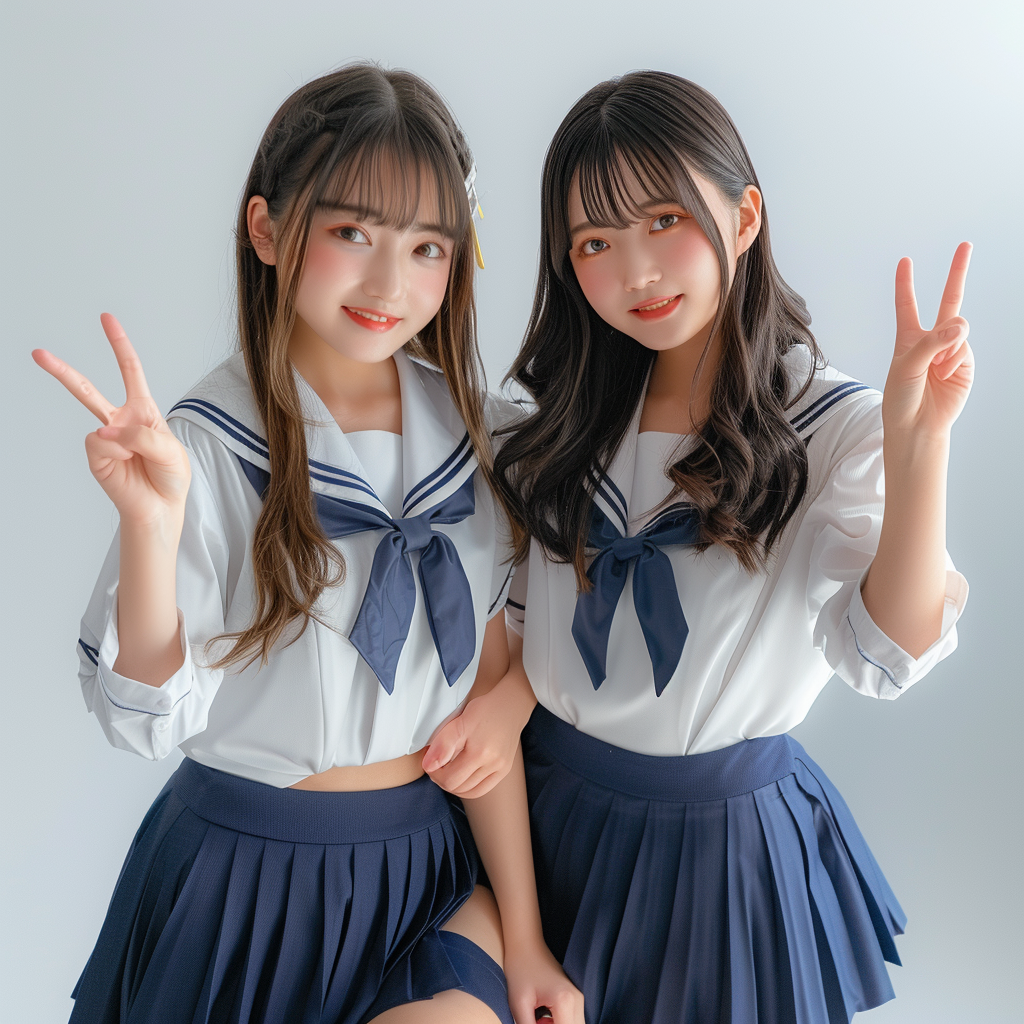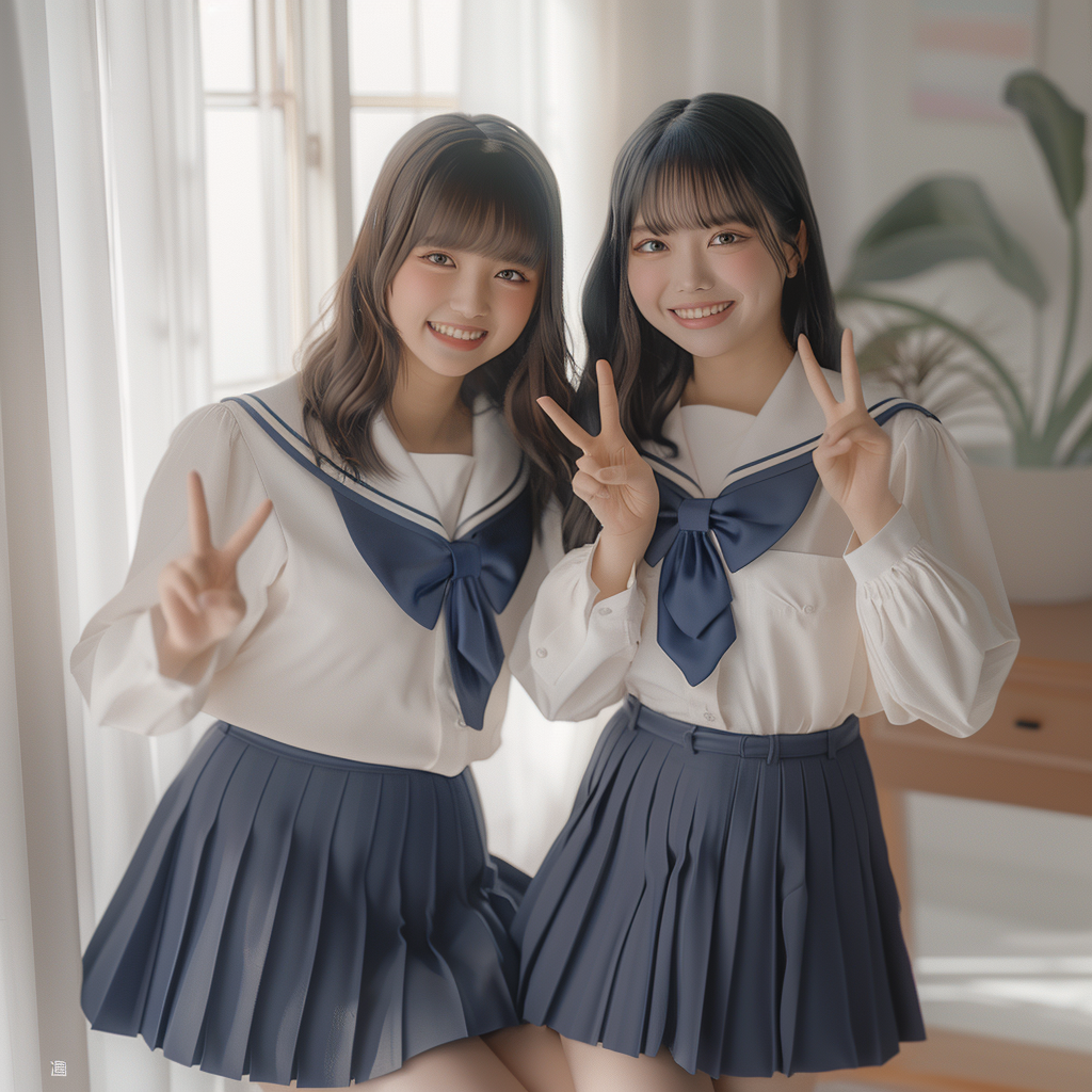 A hyperrealistic 8k portrait of two beautiful Japanese high school girls, 18 years old, wearing white blouses, navy blue pleated skirts, and loose socks, making peace signs and smiling brightly at the camera. They have flawless, glowing skin and expressive eyes. One girl has shoulder-length light brown hair styled in loose curls, while the other has long, straight black hair