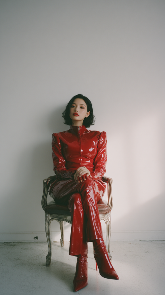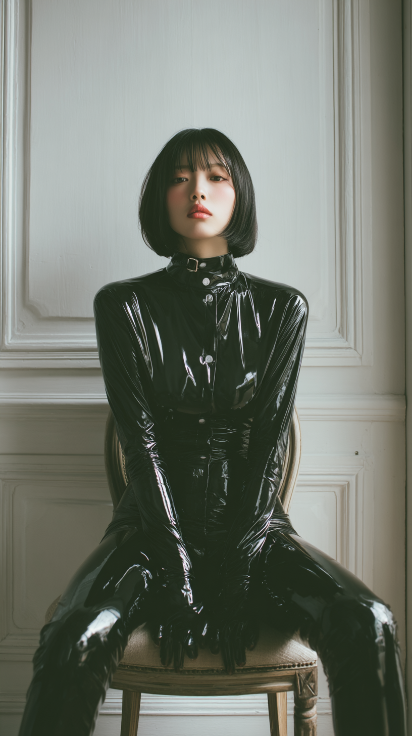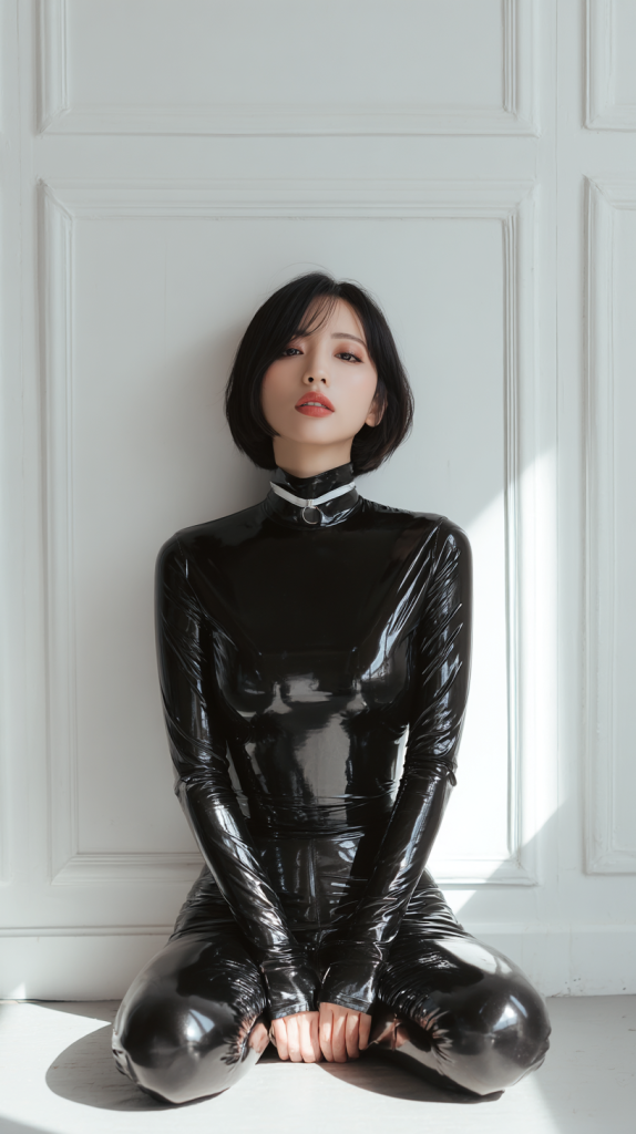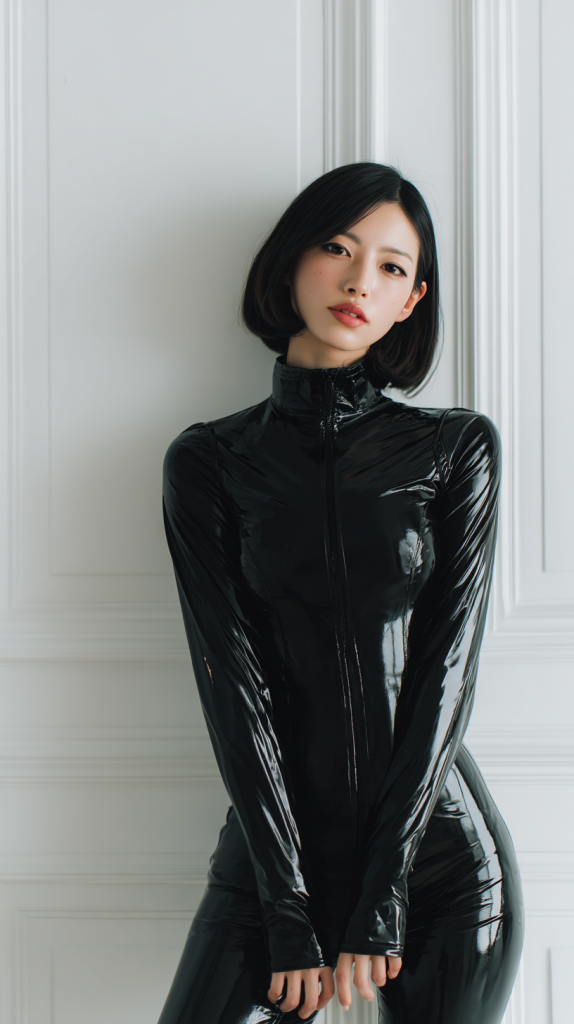 A realistic photo of a 30s Japanese woman standing naturally with arms relaxed at her sides, wearing a black patent leather catsuit, high collar, form-fitting, minimal makeup, shoulder-length black hair, calm expression, standing in front of a white paneled wall, soft natural lighting, fashion editorial style, full-body shot, 9:16 aspect ratio