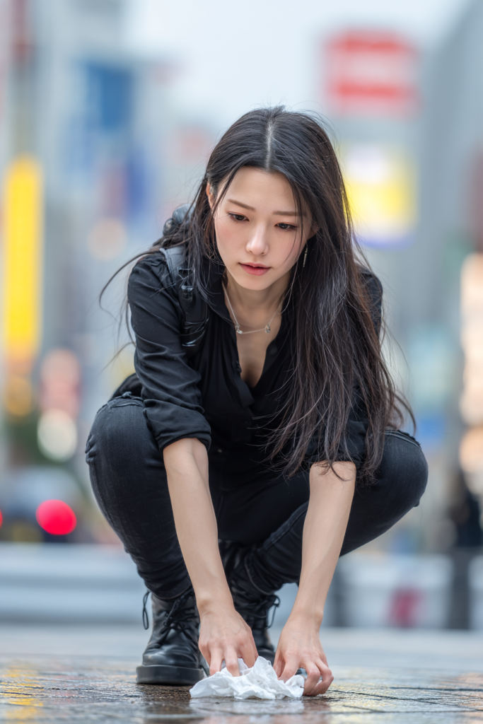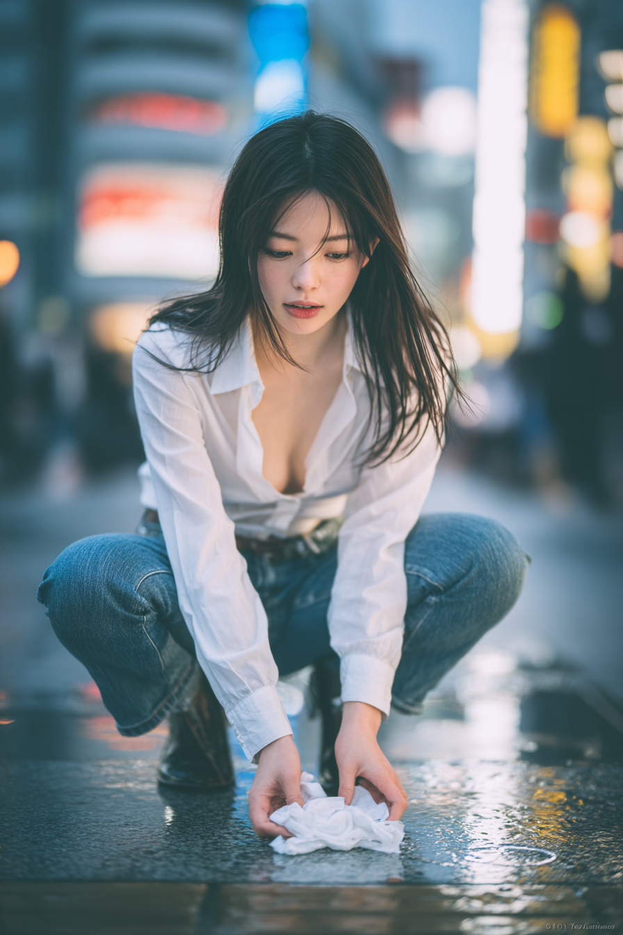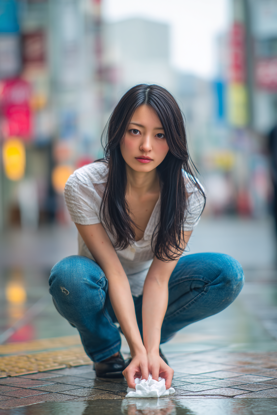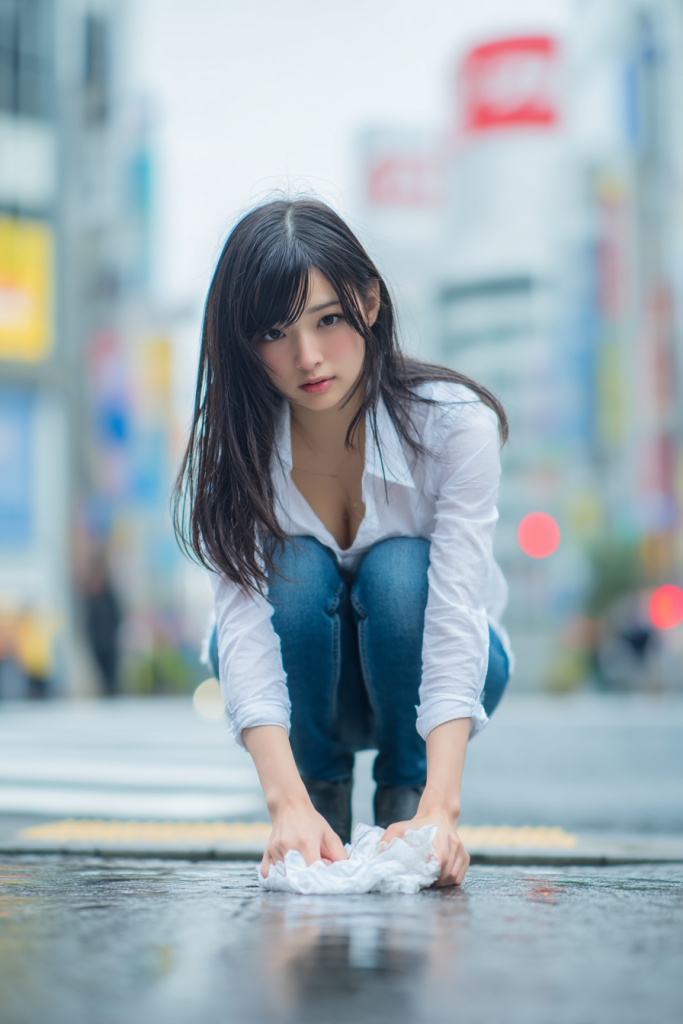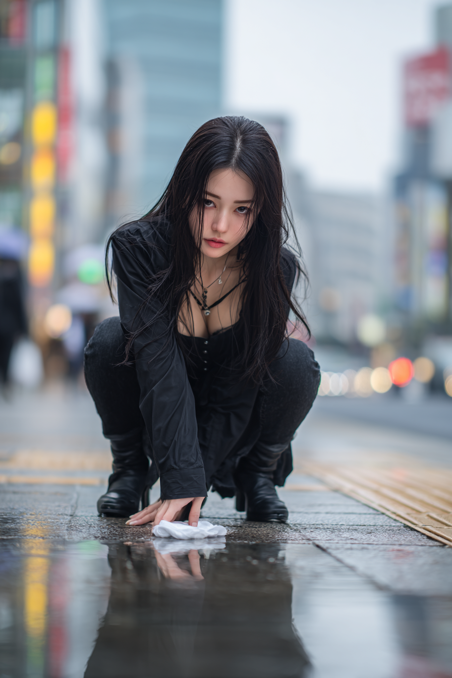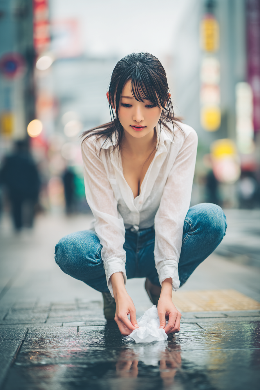 young Japanese woman, 20s, slim build, long black hair, crouching forward to pick up a white handkerchief on a city sidewalk, wearing a black shirt open wide at the chestand tight black jeans, shirt subtly revealing due to leaning posture, focused downward gaze, realistic skin texture, wet pavement with reflections, blurred city background with buildings and signage, soft ambient daylight, photorealistic, 3/4 front view, full body, candid urban moment, beautiful and symmetrical face